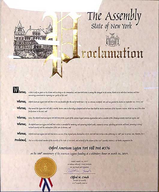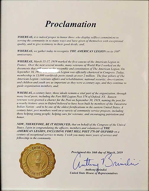 March 16, 2019: Fort Hill American Legion Post 376 Centennial Commemorated